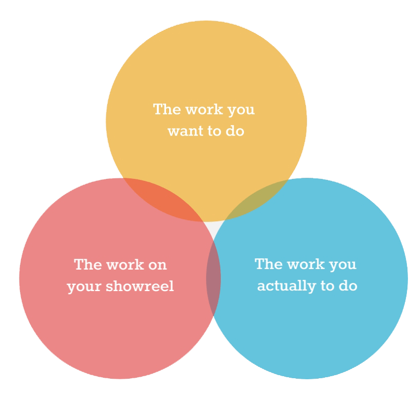 Similarly, when I’m looking at their showreels or websites, there’s often a disconnect between the work a freelancer says they do and their showreel. And often, the description they give themselves doesn’t match what they actually do for their clients. The relationship between the work they do, the work on their showreel and the work they want to to looks something like this: